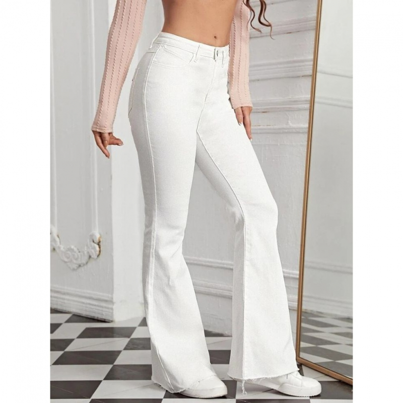 These high-waist button-up flared jeans combine style and comfort with their sleek design. Featuring a trendy flared leg cut and a frayed hem for a casual-chic vibe, these jeans are perfect for daily wear or dressing up for an outing. The button-up front closure ensures a snug fit while adding a touch of elegance. Available in versatile colors, including black, off-white, dark blue, and light blue, these jeans cater to a variety of fashion preferences. Crafted from durable denim, they offer a soft feel and excellent stretch, making them ideal for long hours of wear.