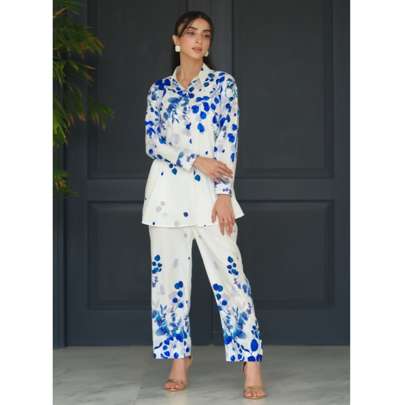 Embrace elegance with our Blue Vine Set, a stunning 2-piece ensemble featuring a tailored trouser and a chic shirt adorned with delicate blue vine patterns. Crafted from premium crepe fabric, this set offers a perfect blend of comfort and sophistication, ideal for both casual outings and special occasions.