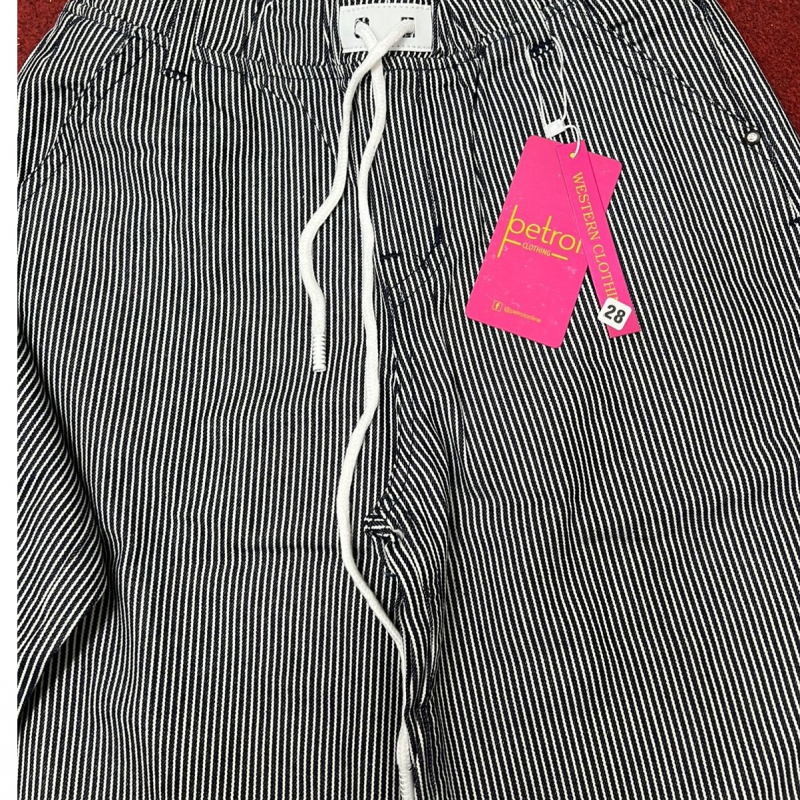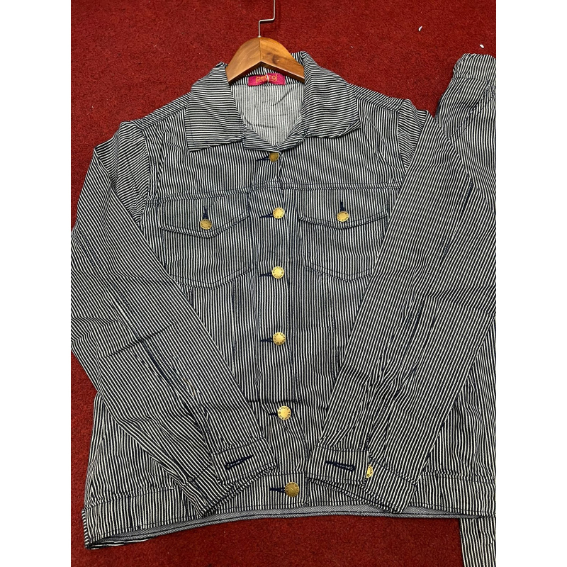 This bold black striped denim set includes a button-down jacket with yellow buttons and wide-leg trousers. The sleek black and white stripes offer a statement look, perfect for casual outings or day-to-day wear.