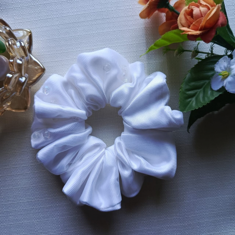 Flaunt your hairstyle with our Double Layered Pearl Scrunchies, a perfect blend of grace and beauty. This handcrafted piece features delicate net fabric layered to create a voluminous yet lightweight look, adorned with soft pearls that exude timeless elegance.  It’s the perfect statement accessory for anyone looking to stand out effortlessly.