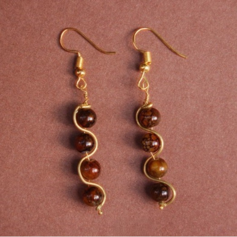 Discover the beauty of these handmade gold wire-wrapped stone earrings featuring a unique spiral design. Each earring showcases polished brown stones, delicately wrapped in a golden spiral, offering a blend of elegance and earthy charm. Perfect for casual or formal wear, these lightweight earrings add a touch of sophistication to any outfit. Get yours now and embrace the timeless style!
