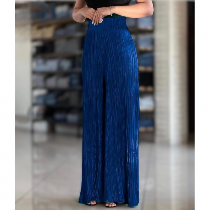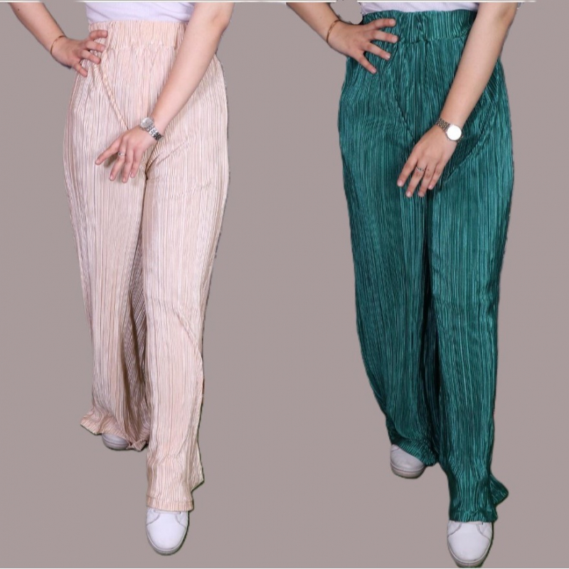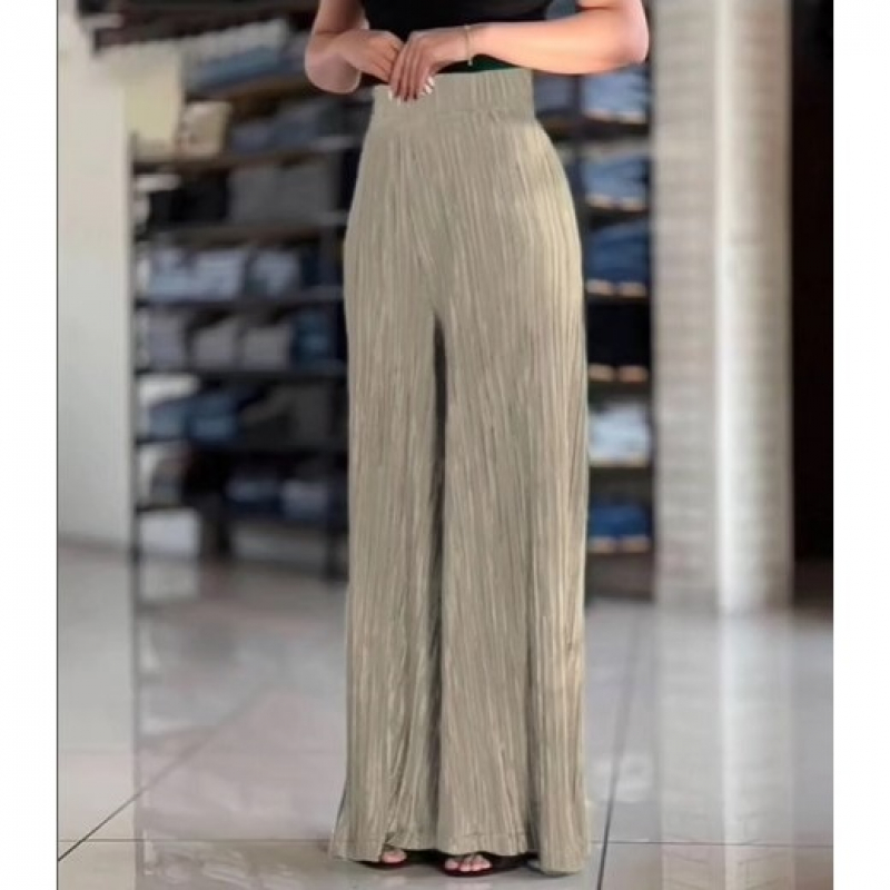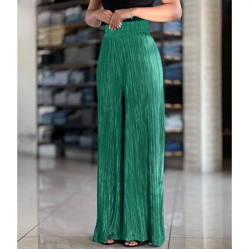 These trousers feature a high-waisted, relaxed fit with a subtle, vertically pleated design that adds texture and movement to the fabric. They come in a versatile color selection, shown here in both a soft beige and a deep green, providing options for both neutral and vibrant looks. The trousers flow down to a full length, offering a chic and comfortable fit ideal for both casual outings and semi-formal occasions. Paired with sneakers, they create a stylish yet laid-back vibe.