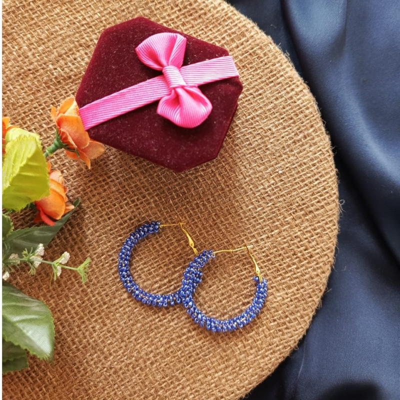Add a touch of elegance to your look with these handmade beaded hoop earrings. The intricate blue beads are woven with care, creating a stylish accessory perfect for any occasion. Lightweight and eye-catching, these earrings are a must-have for those who appreciate handmade craftsmanship.