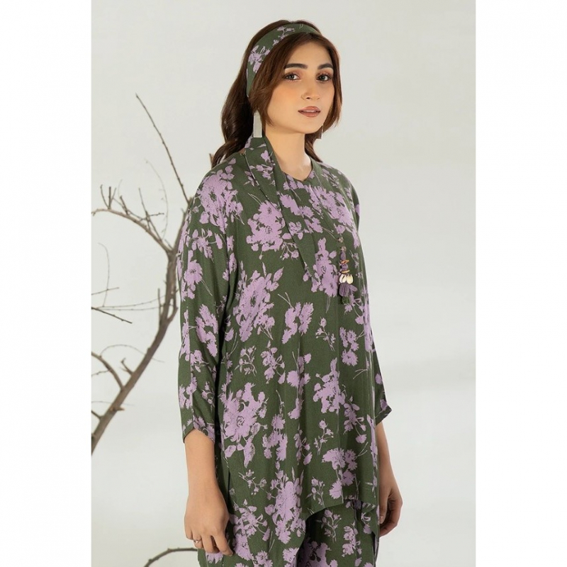 In this two-piece Georgette co-ord set, the center plaquette of the shirt is adorned with a long tassel made of shells and buttons, creating a distinctive and stylish focal point for this captivating outfit.