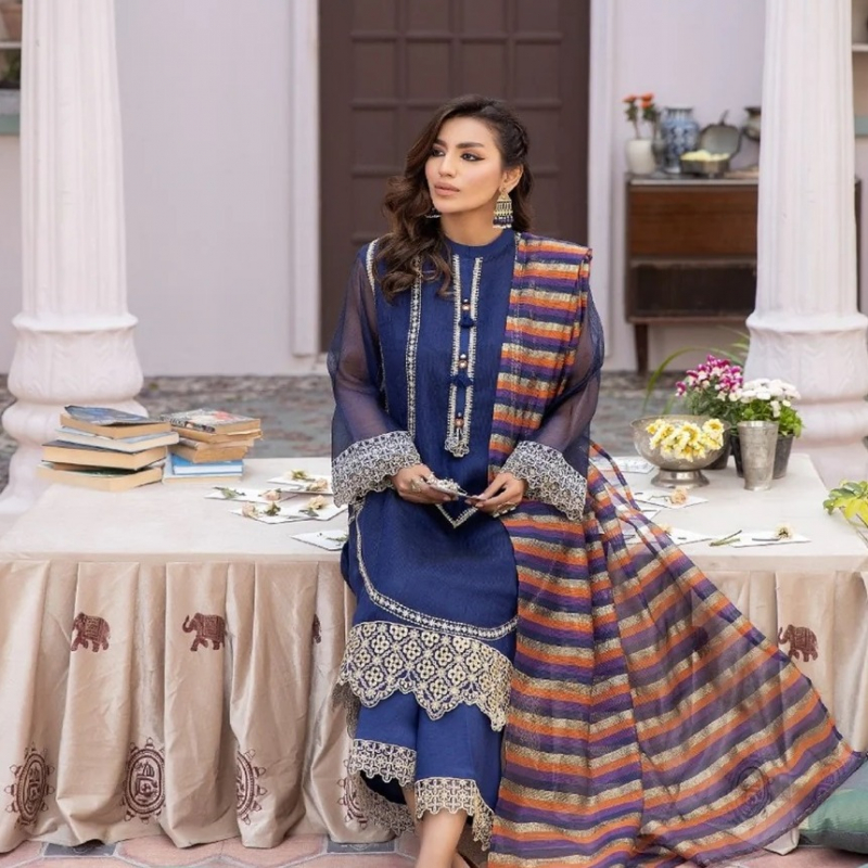 Discover the elegance of the Pret Embroidered Khaadi Net 3 Piece Suit LE-24-03 in Navy Blue. This chic outfit features intricate embroidery, a luxurious Khaadi net fabric, and a perfect combination of traditional and modern style. Ideal for formal and semi-formal occasions