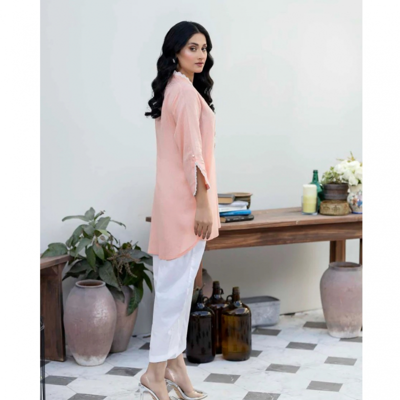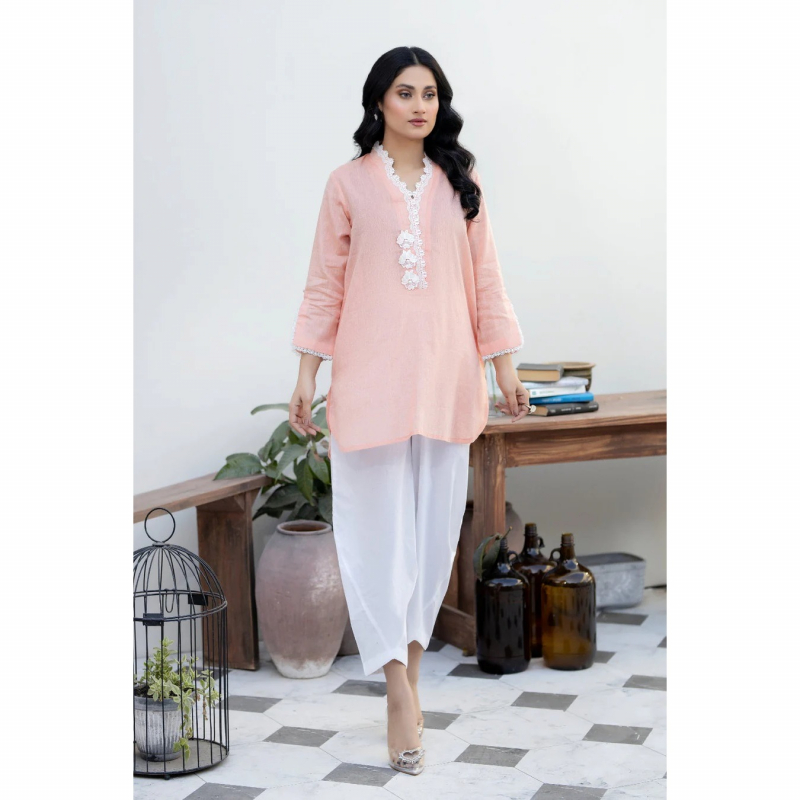 This one piece Cotton Lawn peach shirt has a round hem that adds a touch of modern flair, while delicate lace tracing along the plaquette enhances its appeal, adorned with intricate 3D flowers and pearls along the neckline, gives a refreshing look.