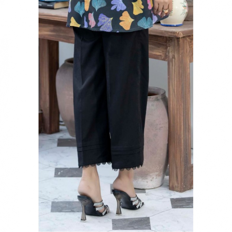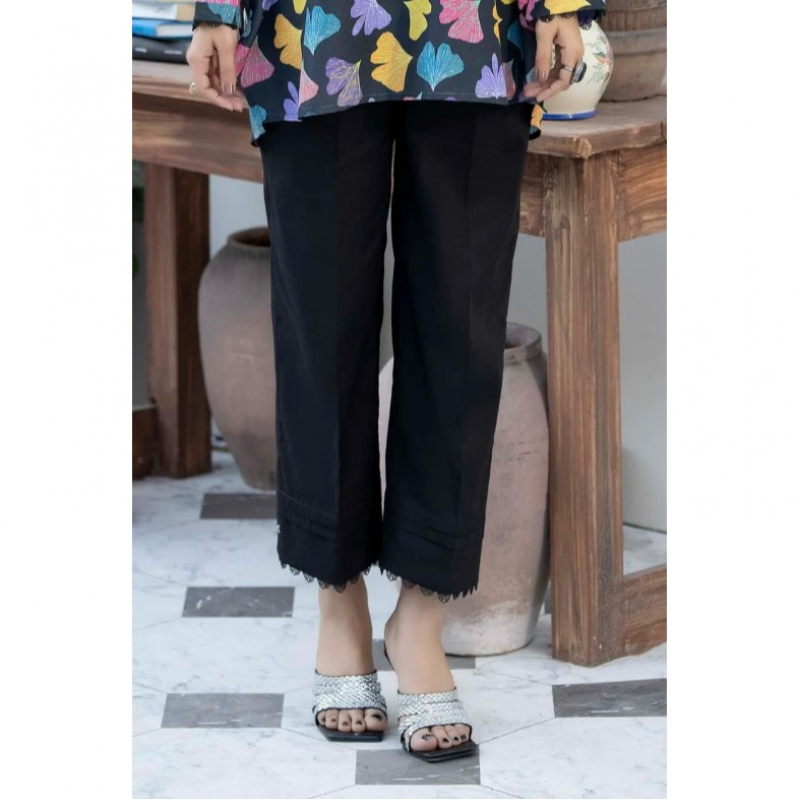 Effortlessly chic, these black cambric trousers blend classic sophistication with subtle detail. Delicate lace accents along the hemline add a touch of feminine charm, making them versatile for both casual and formal occasions.