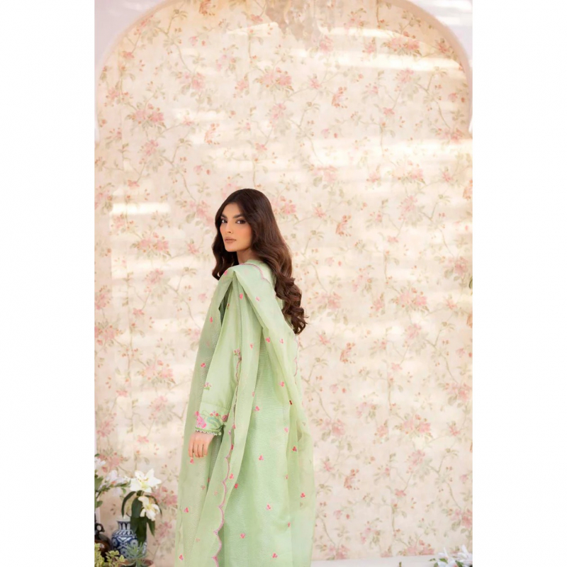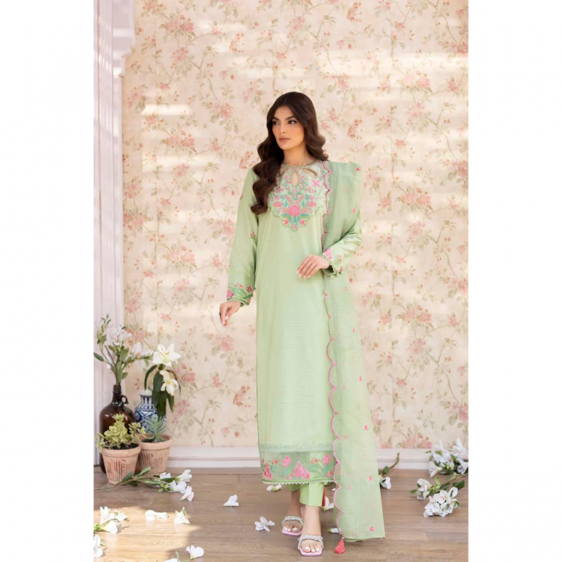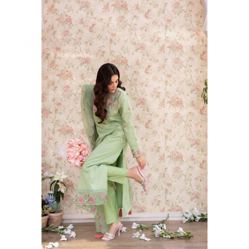 The green three-piece summer outfit is crafted from light and breathable shirt of fine lawn, trouser of cambric cotton & dupatta of Polynet fabric, perfect for warm weather. The set includes a shirt featuring intricate embroidery detailing along the keyhole neckline, embroidered sleeves, and a delicate lace-trimmed embroidered hem. Paired with a matching straight trouser, the outfit is completed with a beautifully designed embroidered Polynet dupatta that adds a touch of elegance to the ensemble. Perfect for a casual day out or a special occasion during the summer season.