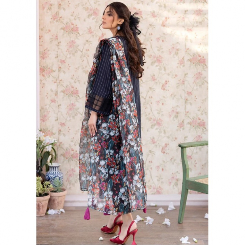 This three-piece dark blue striped shirt exudes sophistication, complemented by beige fabric detailing. The slight V-neckline is adorned with embellished plaquette, adding a touch of elegance, while tassels provide a playful accent. Shirt's fabric is Khaddi Weaved Lawn. Pleated sleeves crafted from organza lend a unique texture, and the culotte trouser completes the ensemble with refined simplicity. Trouser is of cotton. The outfit is paired with a printed Monark dupatta..