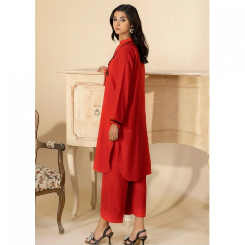 Vibrant red 2-piece self-jacquard set featuring a ban neckline and straight trouser. The shirt showcases a plain plaquette adorned with black embroidery, forming a modern design for a striking look.