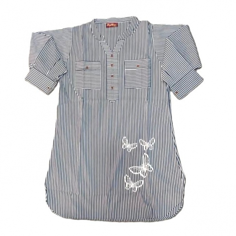 This set features two stylish casual kurtas perfect for everyday wear. The first kurta has a vertical striped pattern with intricate butterfly embroidery on the lower side, while the second kurta showcases a polka-dot design with delicate butterfly motifs on the hem. Both kurtas have comfortable half sleeves and button detailing, ensuring a relaxed yet chic look. Crafted from breathable fabric, these kurtas are ideal for casual outings and day-to-day wear.