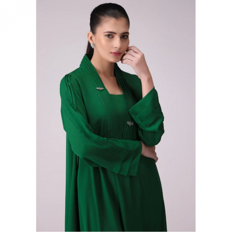 گرین پلیٹڈ نیک لائن اور آستینیں، چاندی کے ٹری ایکسسری سے مزین ہیں، جبکہ فرنٹ اوپن سِلٹ کے ساتھ یہ کشادہ ڈریس آپ کی وارڈروب کے لیے ایک اسٹائلش انتخاب ہے۔