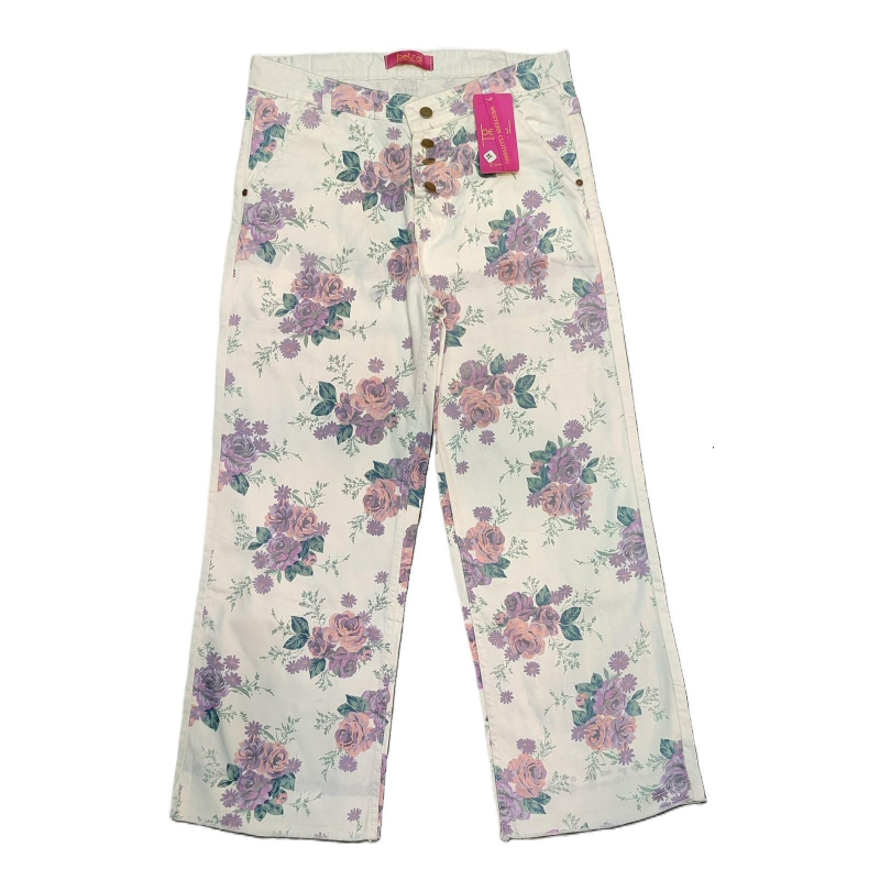 یہ ایک اسٹائلش، فلورل پرنٹڈ جینز ہیں جن پر خوبصورت لائلک گلاب کا ڈیزائن بنا ہوا ہے۔ جینز کا بیس رنگ ہلکا کریم ہے جس پر لائلک اور گلابی رنگ کے گلاب اور سبز پتوں کا پھیلا ہوا ڈیزائن ہے، جو ایک قدرتی اور کلاسیکی انداز فراہم کرتا ہے۔ ان جینز میں بٹن اپ کلوزر دیا گیا ہے جو پہننے میں آسانی اور تفصیل کا اضافہ کرتا ہے۔ سیدھی ٹانگوں کا کٹ انہیں کیژول یا سیمی کیژول انداز کے لیے بہترین بناتا ہے، جو آپ کی الماری میں نسوانیت اور خوبصورتی کا اضافہ کرتا ہے۔
