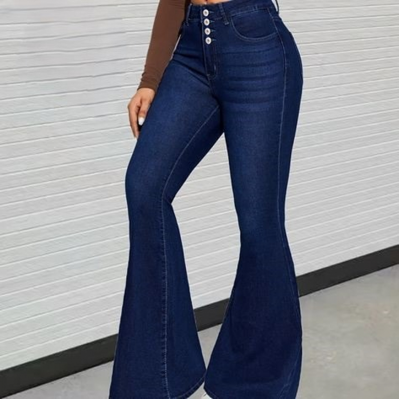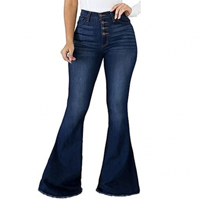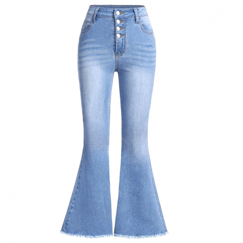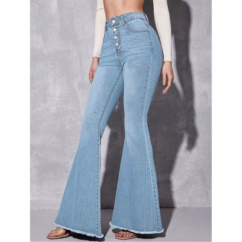 These stylish bell-bottom jeans come in three shades of blue, featuring intricate details and a modern design: